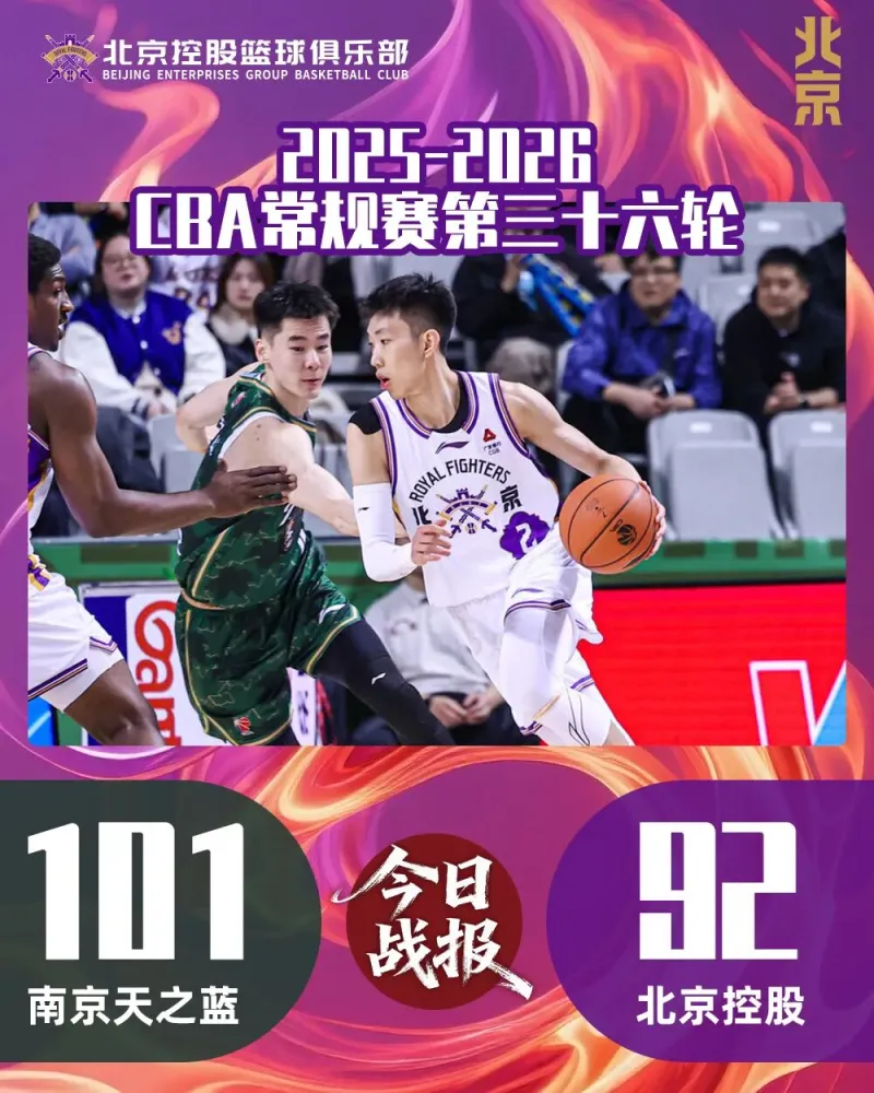 虎扑04月09日讯 据北控男篮发文,4月8日,北京控股男篮客场挑战南京天之蓝。全场比赛跌宕起伏,北控男篮在上半场占据主动,第三节手握领先优势的情况下,末节突然攻防两端双双断电,被南京打出一波进攻高潮完成逆转,最终92:101落败。